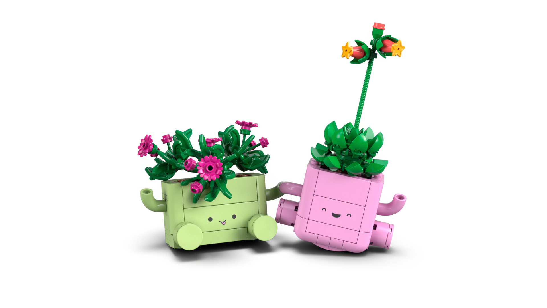 - 2 LEGO® PLANTS – Craft a delosperma (ice plant) named Lumi with purple buds, an echeveria named Ellie with a tall stem and coral buds, plus 2 plant pots with arms, legs and smiley faces