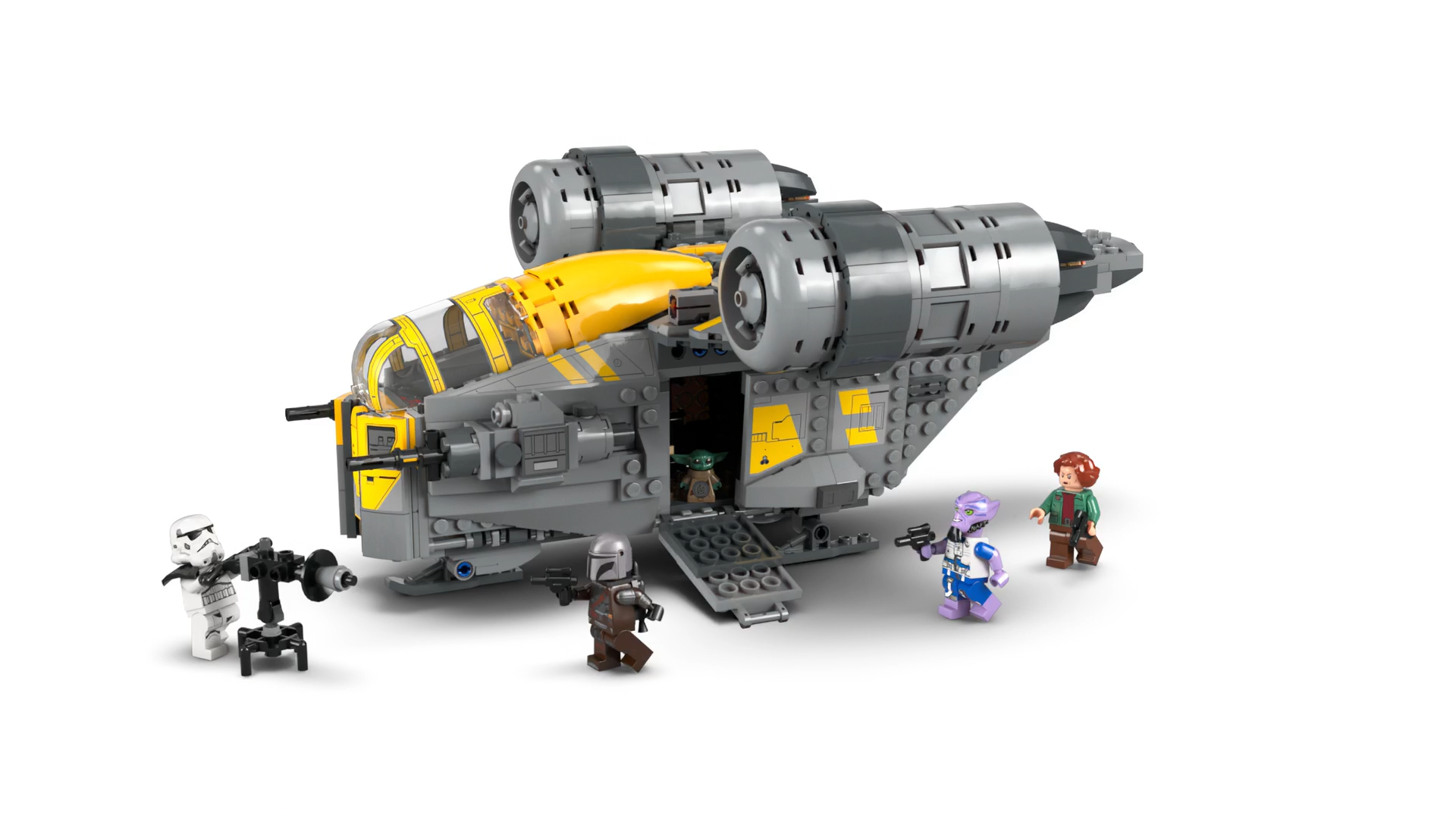 - THE RAZOR CREST – Place 2 LEGO® minifigures and Grogu in the cockpit, open the side panels for access to the engine and cargo compartment, fold down the landing ramps and activate the 2 stud shooters